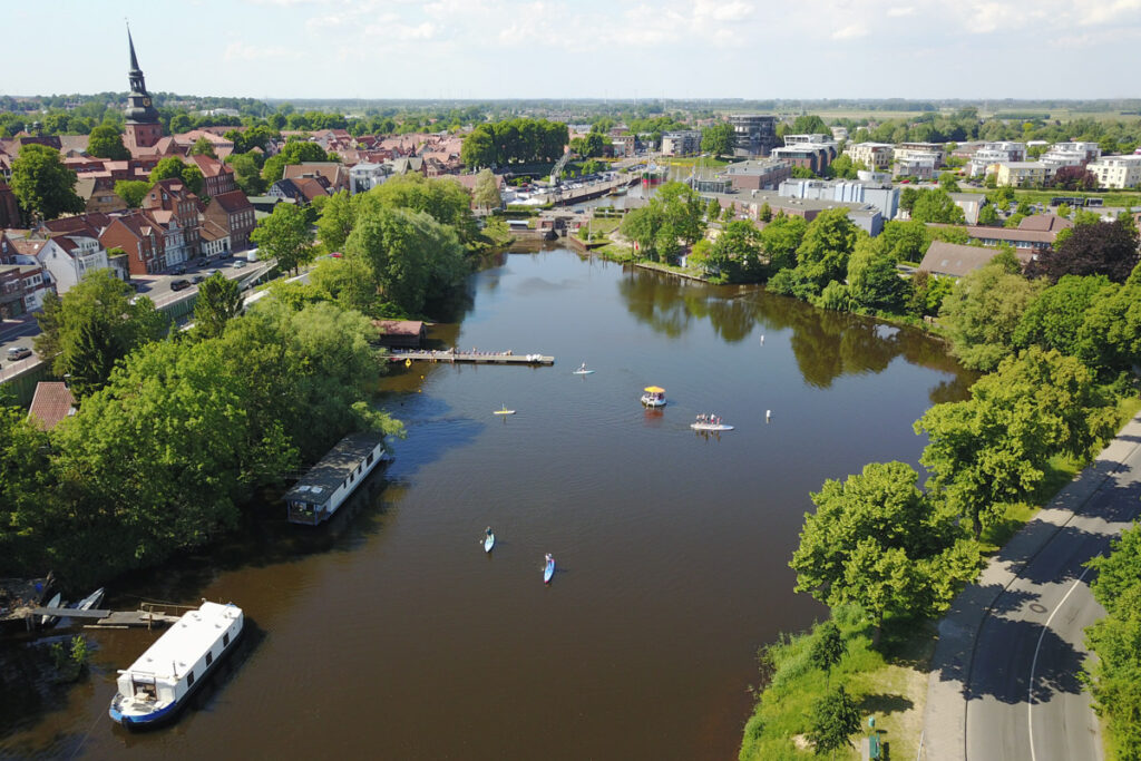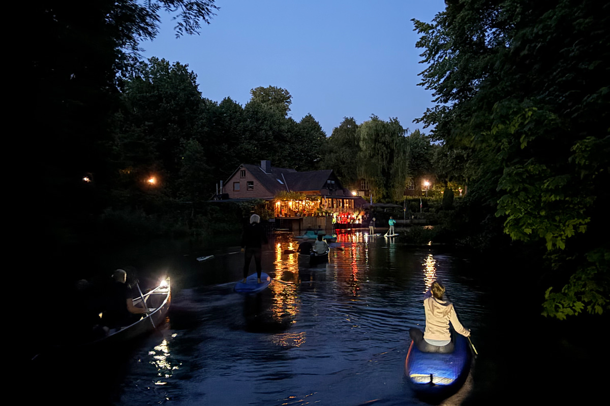 Die Lange Nacht in Stade bietet den Rahmen für diese beliebte Sondertour aus unserem Angebot Vollmond/Lichter Tourenüber den Burggraben. Begleitet von einem SUP CLUB Guide durchpaddelst du die Dämmerung hinein in die Nacht.