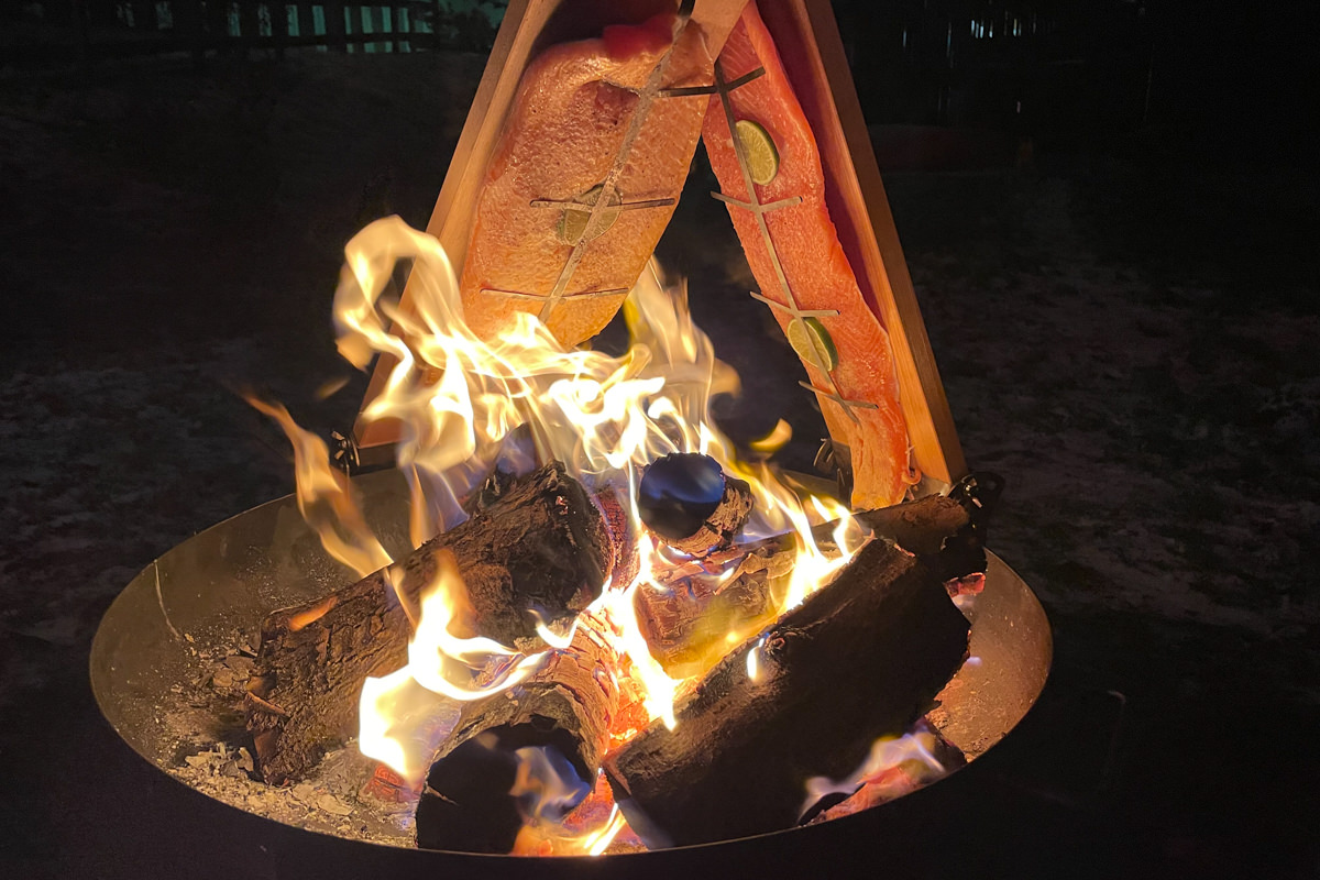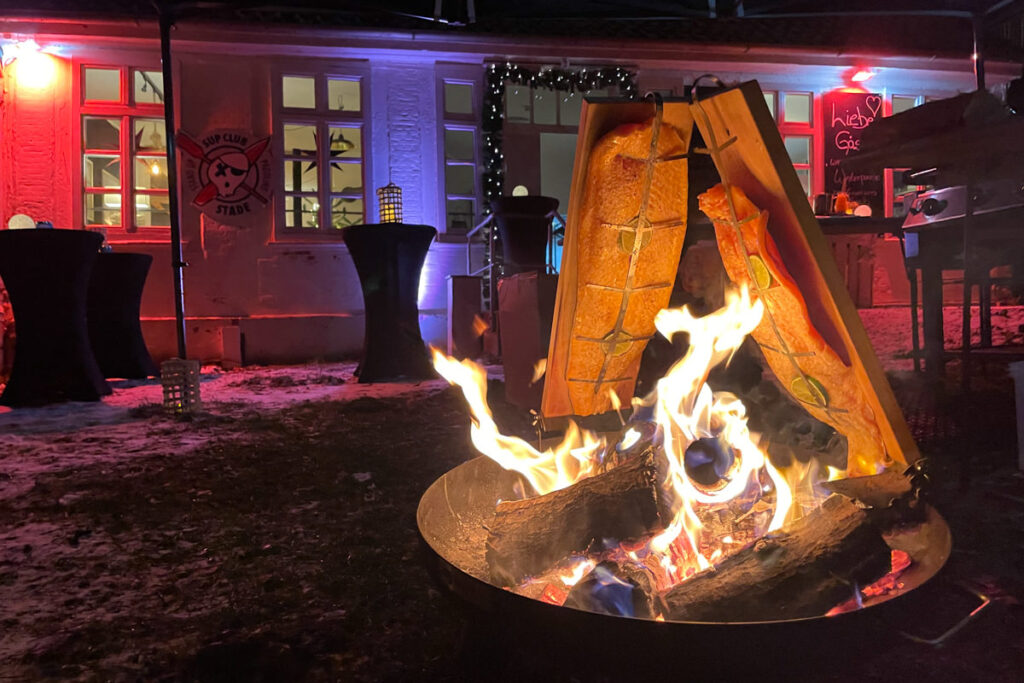 • Wir gestalten eine Grillstation mit extra Feuerkorb für das „Livecooking“ des Flammlachs.